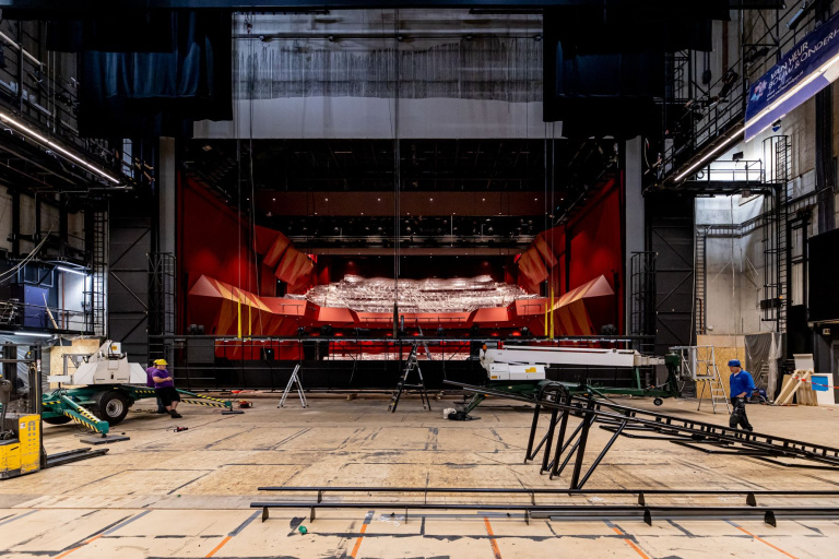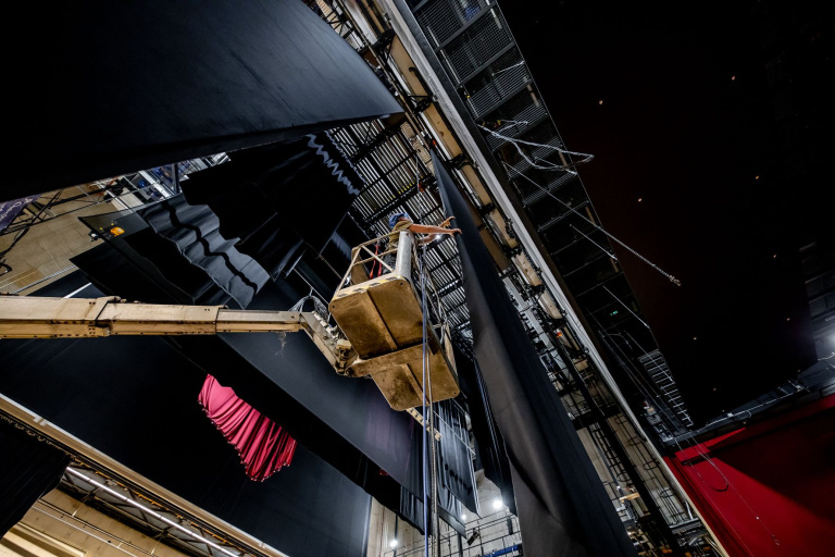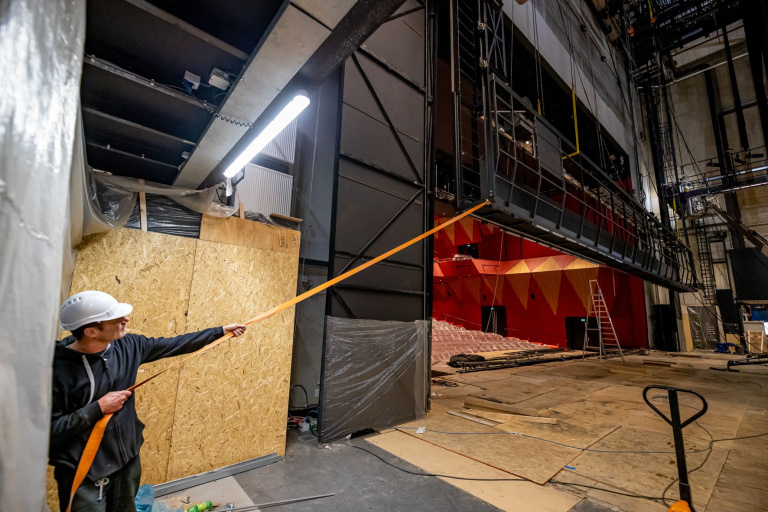 De verbouwingswerkzaamheden van de laatste fase van de verbouwing in Theater aan het Vrijthof gaan gestaag door: afgelopen week varieerden de werkzaamheden van het bekleden van de manteaus (afstoppingen) met zwart doek tot het inhangen van de nieuwe portaalbrug aan de geleidingen. Twee hoogwerkers en diverse mensen kwamen eraan te pas om de zware portaalbrug naar boven te takelen. Het was een heel karwei dat om de nodige precisie vroeg!