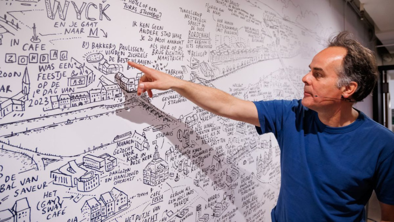 Beeldend kunstenaar Jan Rothuizen maakte in de artiestenfoyer van Theater aan het Vrijthof een tekening van de stad Maastricht. Die bevindt zich in de kelder van het theater waar acteurs, musici, dansers en cabaretiers zich voorbereiden op hun stuk, concert, choreografie of optreden. Om ze een idee te geven van de stad waarin ze zich bevinden maakte Rothuizen, die zelf in Amsterdam woont, een wat hij noemt ‘zachte atlas van Maastricht’. Een kaart die niet volledig wil zijn en die zich niet beperkt tot gebouwen en monumenten maar die persoonlijk is en ook iets zegt over het karakter van de stad.