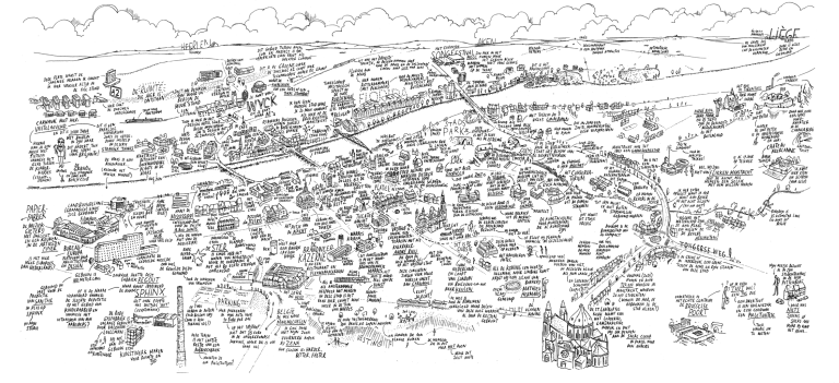 Rothuizen (1968) bezag de stad met de blik van een buitenstaander. ‘Eigenlijk kende ik de stad niet zo goed’, bekent de tekenaar die regelmatig in de Volkskrant publiceert, exposeert en een aantal boeken maakte. ‘Een beetje zoals de meeste Nederlanders Maastricht kennen, als dagjesbezoeker. Maas, Pietersberg, Vrijthof, dat zijn de ijkpunten voor de gemiddelde toerist’. Uiteraard begon Rothuizen zijn tekentocht bij de opdrachtgever: Theater aan het Vrijthof. Hij kreeg enkele gidsen mee (historicus Joes Minis, Ed van Hees en Peter Snellens van het theater en designstudent Yense Meij) en ging op ontdekkingsreis. Aanvankelijk dacht hij vanuit het theater al tekenend naar het zuiden te wandelen, in de richting van de Pietersberg. Maar zijn compagnons wezen hem er fijntjes op dat de kaart dan wel erg onvolledig zou worden, Maastricht is immers meer dan het centrum en het welvarende Sint Pieter.