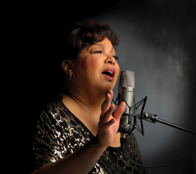 Met haar warme, diepe stem, neemt ze de wervelende ritmesectie uit de big band mee, het Millenium Jazz Trio.