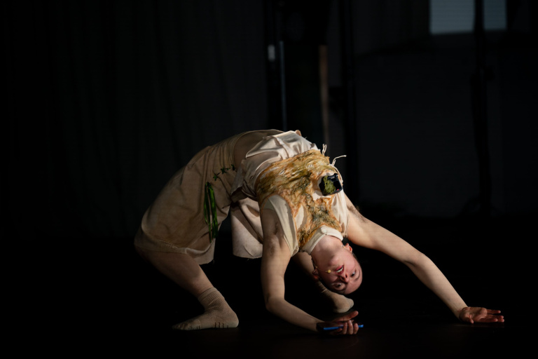 Met camera’s in het kostuum bepaalt het lichaam zelf wat zichtbaar wordt. Close-ups van huid en beweging verschijnen direct op scherm, terwijl geluiden zoals ademhaling en wrijving de fysieke ervaring versterken. Dans en video ontstaan tegelijk en beïnvloeden elkaar in real time, waardoor het lichaam zichtbaar wordt als iets veranderlijks en niet vast te leggen in één betekenis.