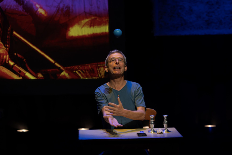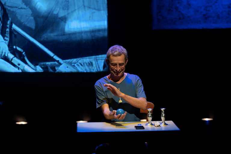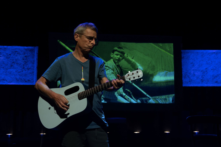 Er komen vissen langs, een stress balletje, een gitaar, en hij speelt op een mooi kleed uit zijn eigen huiskamer. Zo een voorstelling is het.
