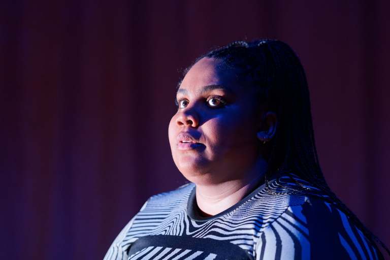 "Isabelle Kafando ondergaat in ‘Rof daaimund’ vele metamorfosen, en pakt het publiek in met haar warme, zuivere stem."