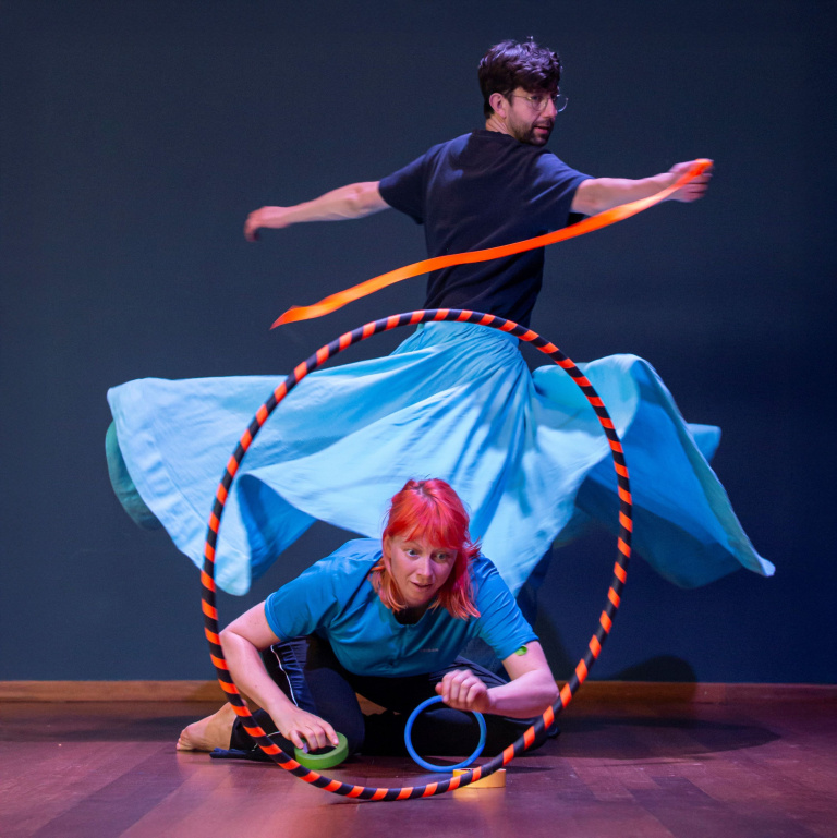Alles kan draaien in OM en OM en OM. De paraplu, de hoepel, de stoel, de wereld. Karlijn draait om, Bram draait om en om, Karlijn draait om en om en om. Waar is Bram nou? Een voorstelling voor de allerkleinsten over verdwijnen en verschijnen, over reiken en pakken, over samen zijn – en dan weer even alleen. Wat weg is, komt terug. Wat ver lijkt, komt dichtbij. Soms zie je iets pas als je even omkijkt. En als de laatste draai gedraaid is, mogen de kinderen zelf dansen en hun eigen draai vinden. Nog een keer?