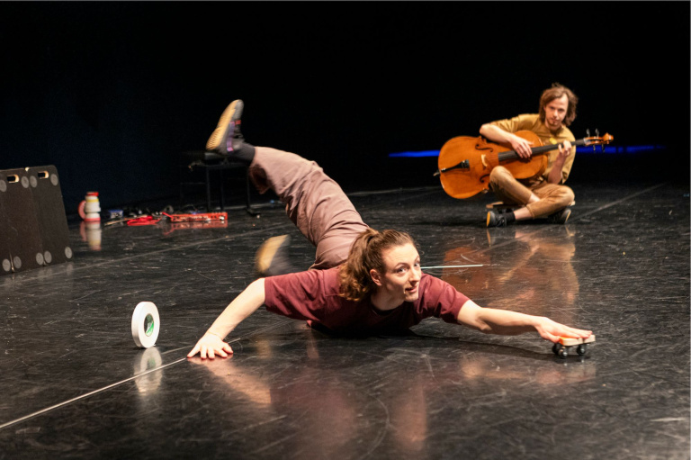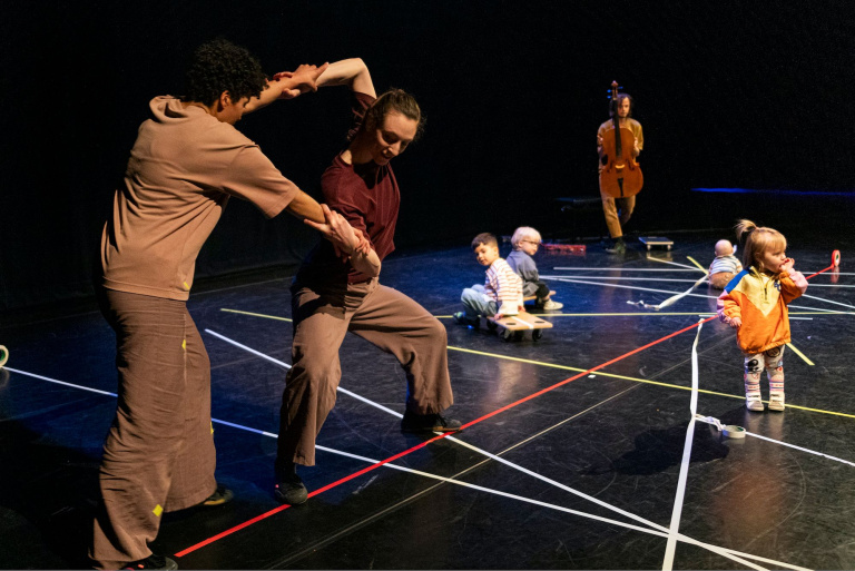 Streep Wiel Rol is een muzikale danstheatervoorstelling die draait om beweging en ontdekken.