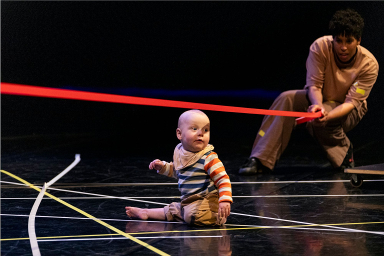 Een danser, een circusartiest en een cellist onderzoeken een ruimte vol lijnen en wielen, begeleid door de klanken van de cello. Het publiek wordt langzaam maar zeker steeds meer de speelvloer opgehaald. Peuters en ouders storten zich op rollen toneeltape, maken lijnen of peuteren ze los. Op karretjes rollen de kinderen voorbij.