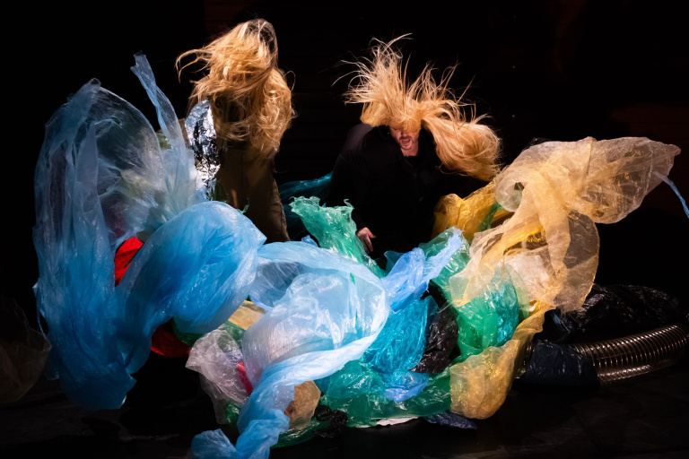 Een wereld waait voorbij. In een landschap van dansende stukken stof, plastic zakken en zwevende kubussen dwalen twee aandoenlijke figuren die het gevecht tegen wind allang verloren hebben maar niet zullen opgeven. Hoe verhouden we ons tot iets dat vruchtbaar maar ook destructief is?