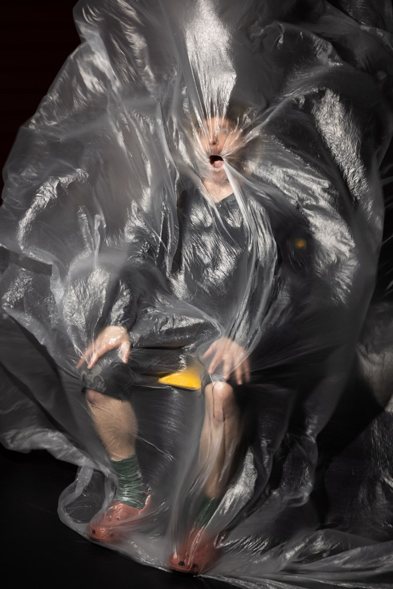 Tochtgat speelt met de esthetiek van gedrapeerde stoffen op schilderijen van Rubens, de herkenbare humor van slapstick en de impact van levensgrote moderne beeldende kunstwerken.